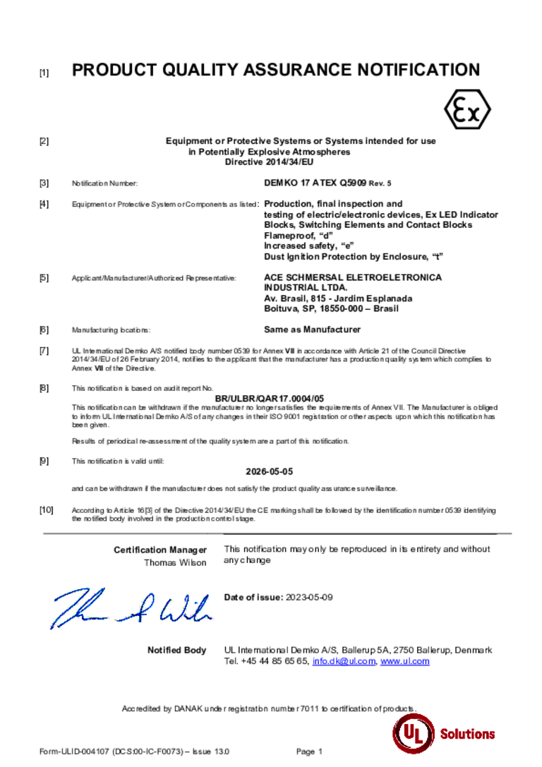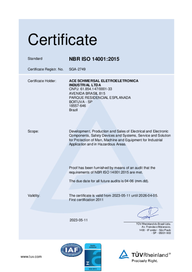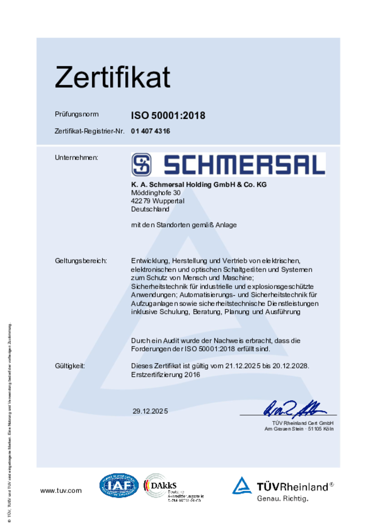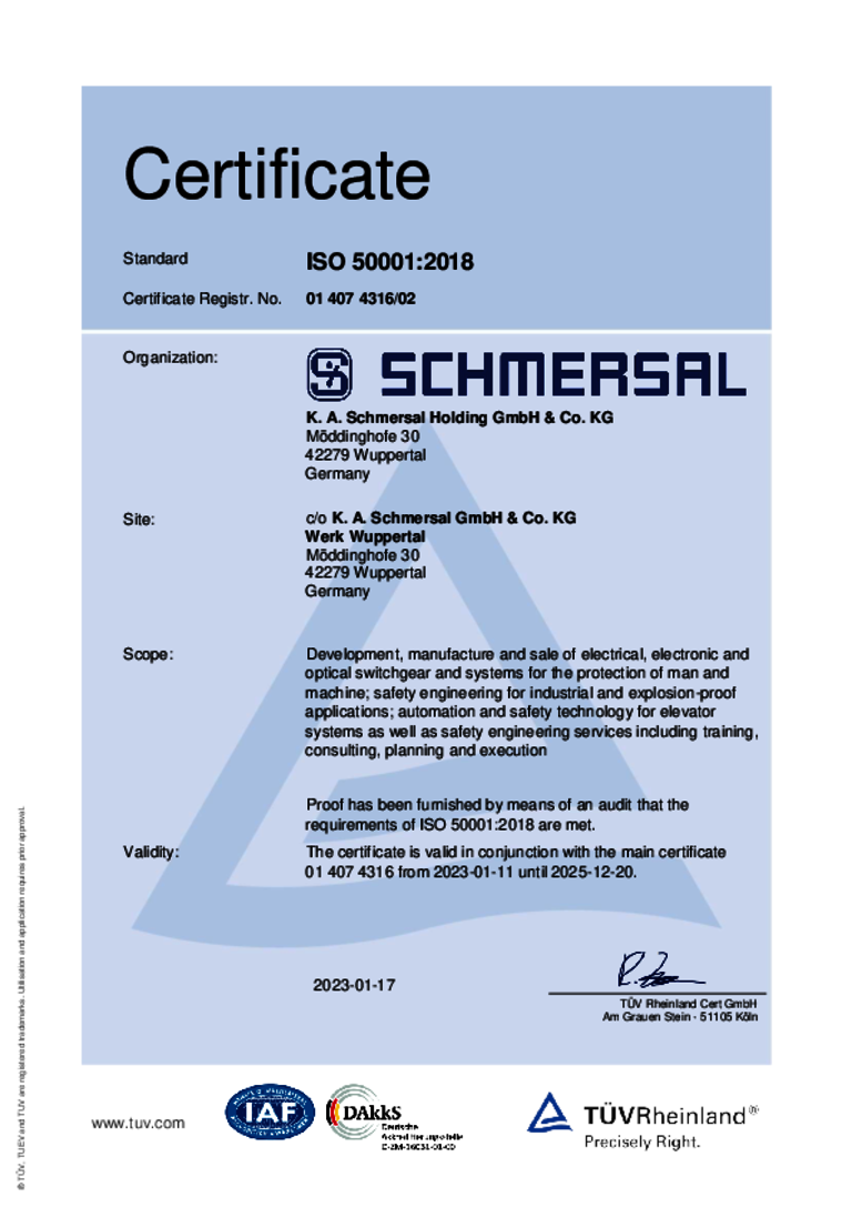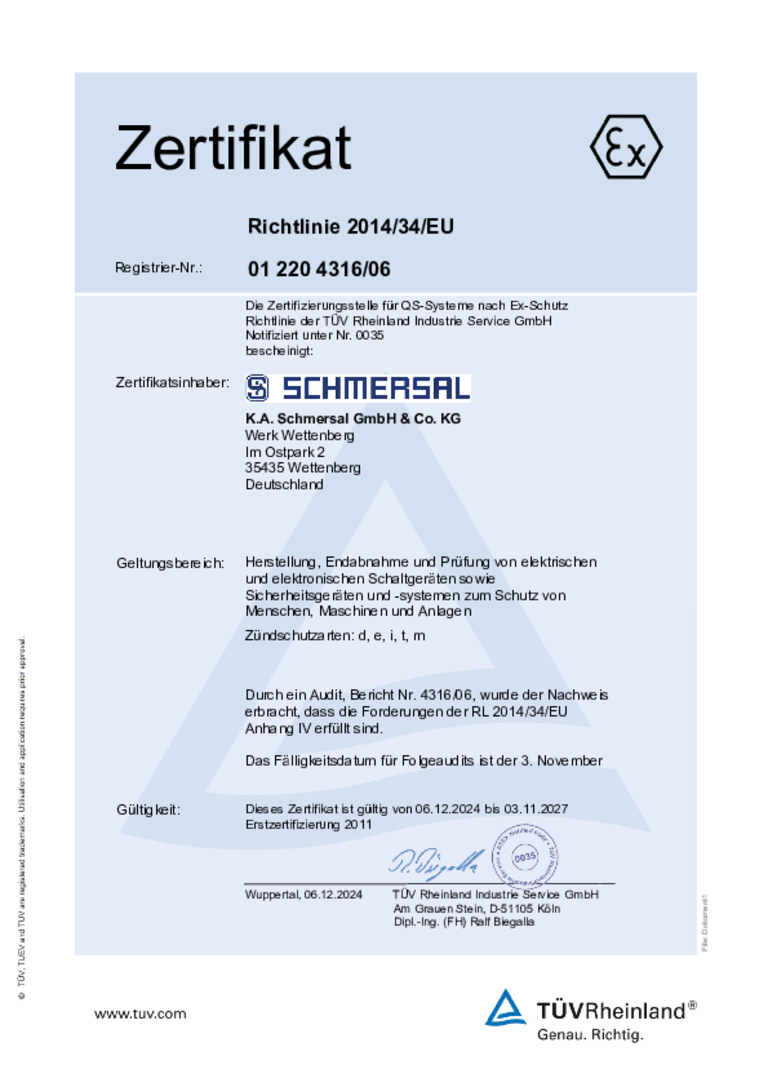 All Schmersal Group sites developing and producing switchgear for explosion-protected applications also have certification in accordance with DIN EN ISO 9001, which stipulates certification and approvals for the QM system based on the applicable guidelines and standards. This is another feature of the high quality standards of the Schmersal Group. This guarantees the requisite safety in the very sensitive area of (safety) switchgear for explosion-risk environments.