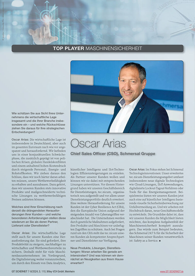 Schmersal focuses on technological innovation. Our extended tec.nicum service offering includes new digital technologies such as cloud solutions, IIoT applications, digitalised lockout/tagout procedures and tools for energy management,' says Oscar Arias in an interview with the magazine GIT Sicherheit & Management.