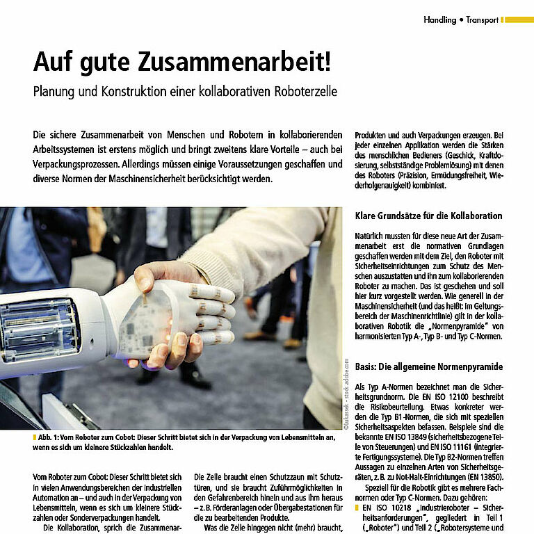 Safe collaboration between humans and robots in collaborative work systems is both possible and offers clear benefits, including in packaging processes. There are, however, a number of prerequisites that need to be satisfied, and several machinery safety standards that must be taken into consideration
