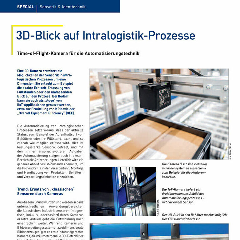 A 3D camera expands the options offered by sensor systems in intralogistics by another dimension. This allows the camera to offer precise real-time capture of fill levels or a comprehensive view of the process. In addition, it can also be used as the ‘eye’ of IIoT applications, allowing it to determine KPIs such as ‘Overall Equipment Efficiency’ (OEE).